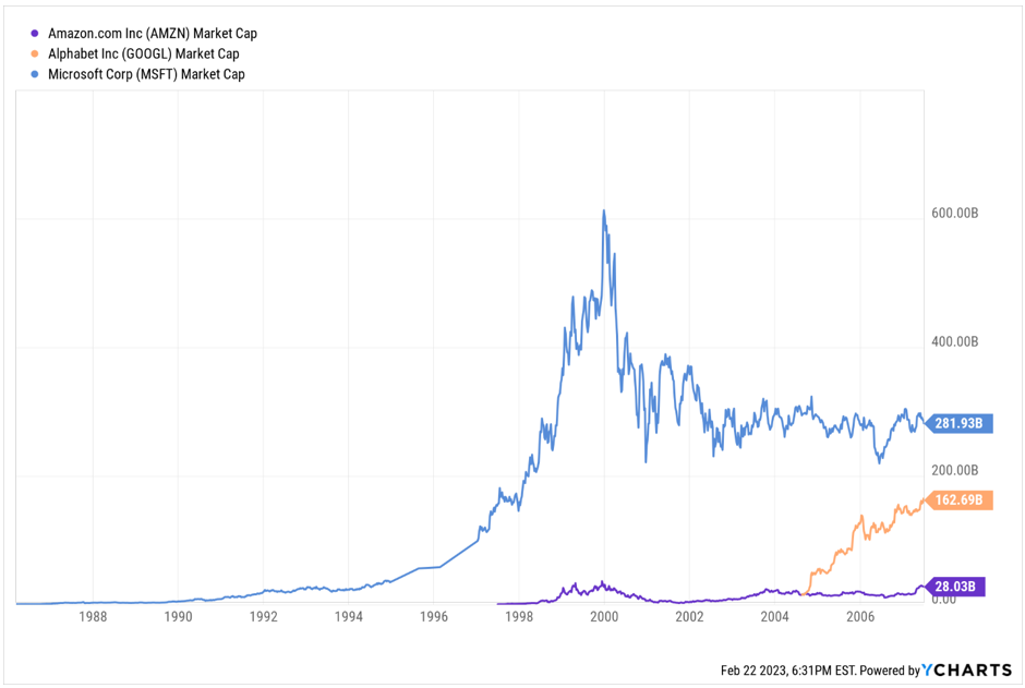 In the 15 years between the dawn of the internet and the iPhone’s launch, tech titans Amazon (AMZN), Alphabet, and Microsoft aggregated a total combined market value of about $500 billion.